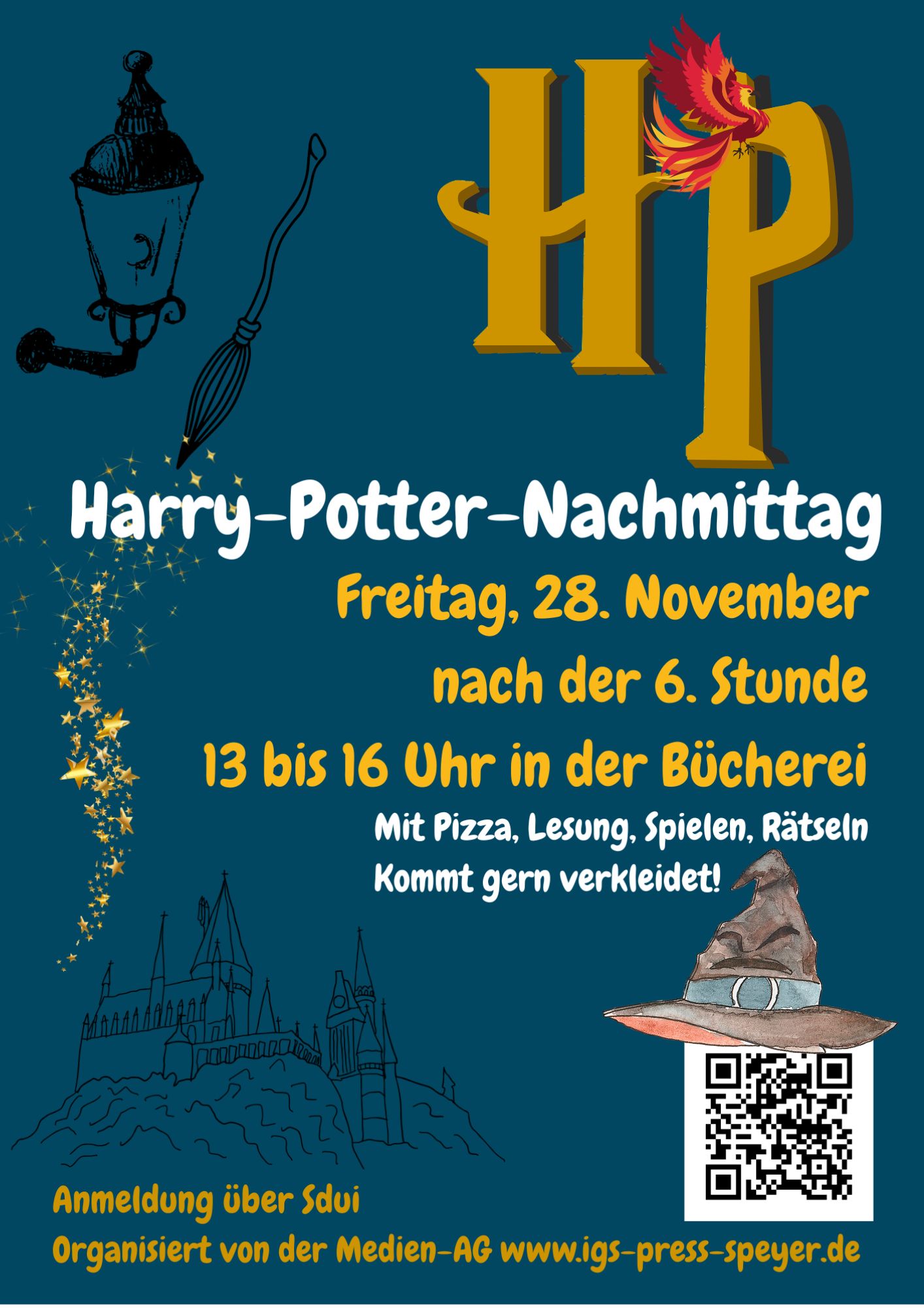 Am Freitag, 28. November lädt euch die Medien-AG der IGS zum Harry-Potter-Nachmittag ein! Direkt nach der 6. Stunde (um 13.05 Uhr) geht es in der Mensa los: Wir stärken uns mit Pizza, die der Förderverein uns schenkt. Ab 13.30 Uhr lesen euch Schülerinnen und Schüler in der Schulbücherei aus den Harry-Potter-Büchern vor. Danach werden wir mit euch spielen und rätseln. Die wichtigste Frage zuerst: Zu welchem Hogwarts-Haus gehört Ihr? Der sprechende Hut beantwortet sie. Mit eurem Hausteam fliegt Ihr auf dem Besen, beantwortet Quizfragen, sucht Sachen, findet Lösungen und verköstigt „Leckereien“. Um 16 Uhr habt Ihr die Rätsel gelöst und das Gewinner-Hausteam steht fest: Hufflepuff? Slytherin? Ravenclaw? Oder Gryffindor?